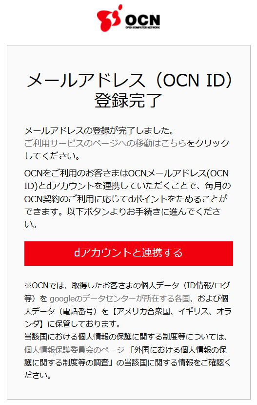 引き続き、dアカウントとの連携に誘導されます。ここの説明の中に、OCNでは個人データをGoogleに引き渡していることが書かれています。「すべての情報はGoogleにつながる。」みたいな世界になってきているんですね。