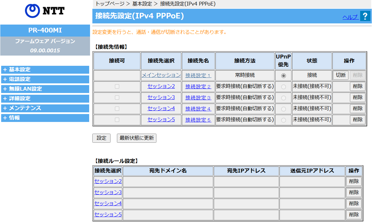 ここで、疑問が出てきました。この画面の接続先設定が(IPv4 PPPoE)になっているのです。接続は「IPoE(IPv4 over IPv6)」が可能だと説明されていたので、IPv6が使えないとトホホなプロバイダ変更ということになってしまいますね。