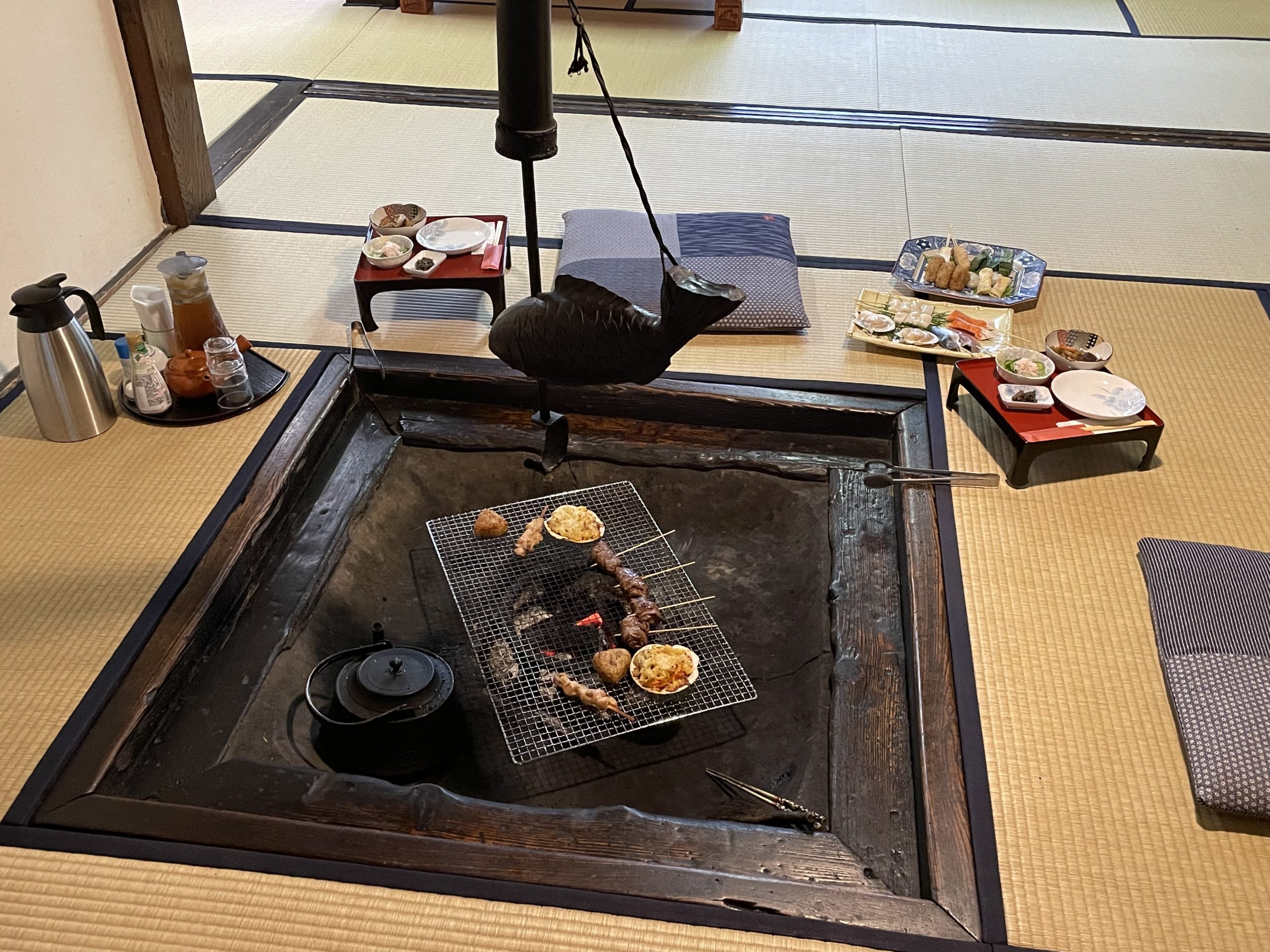 懐かしい思いが蘇りそうな囲炉裏での食事ですね。