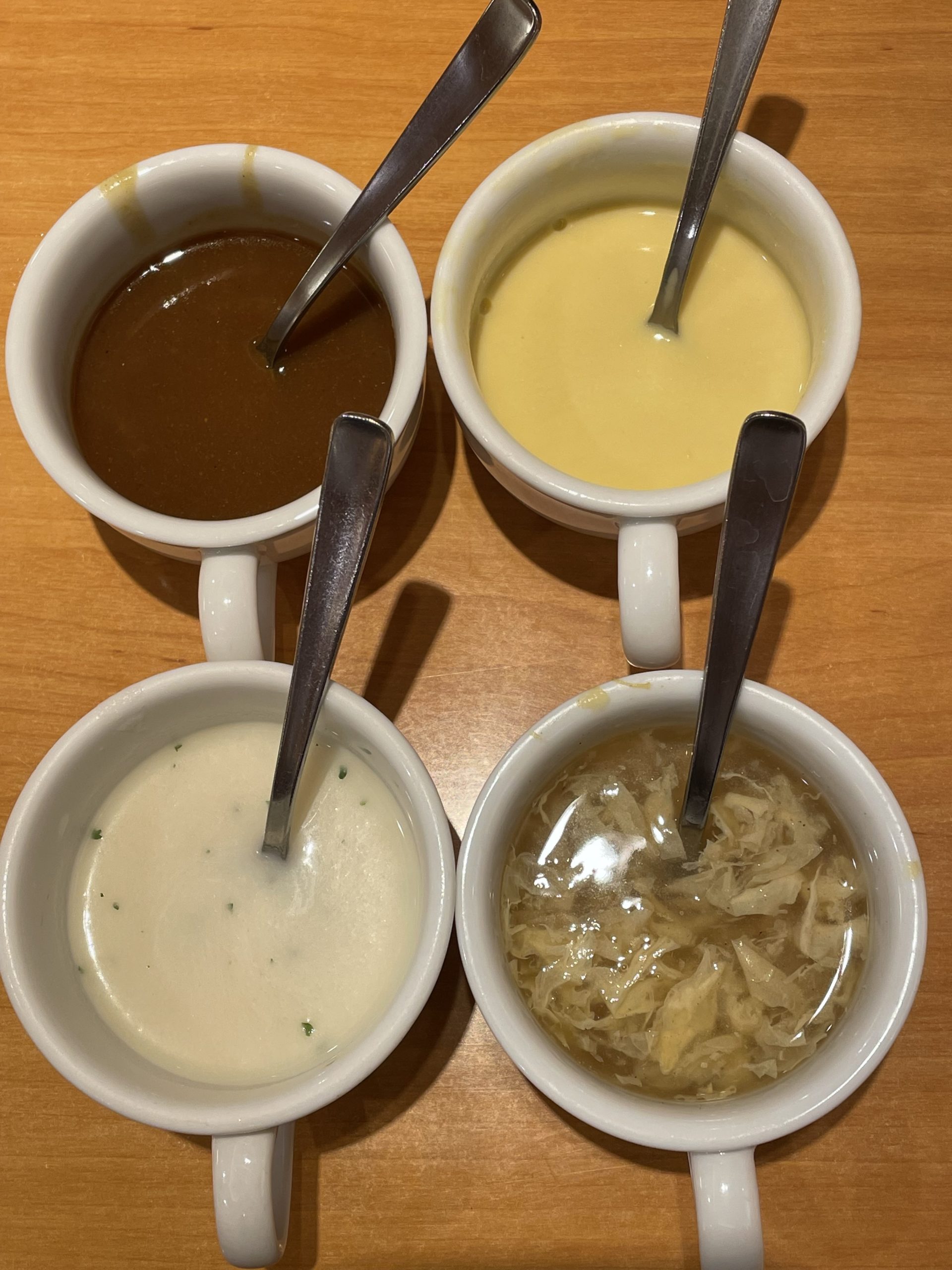 この店は、広くてテーブルがゆったりしていていい感じですね。今日は、スープバー4種のスープに感動したので写真を撮ってみました。何杯がおかわりすると、それだけでもお腹にたまって満足が得られます。