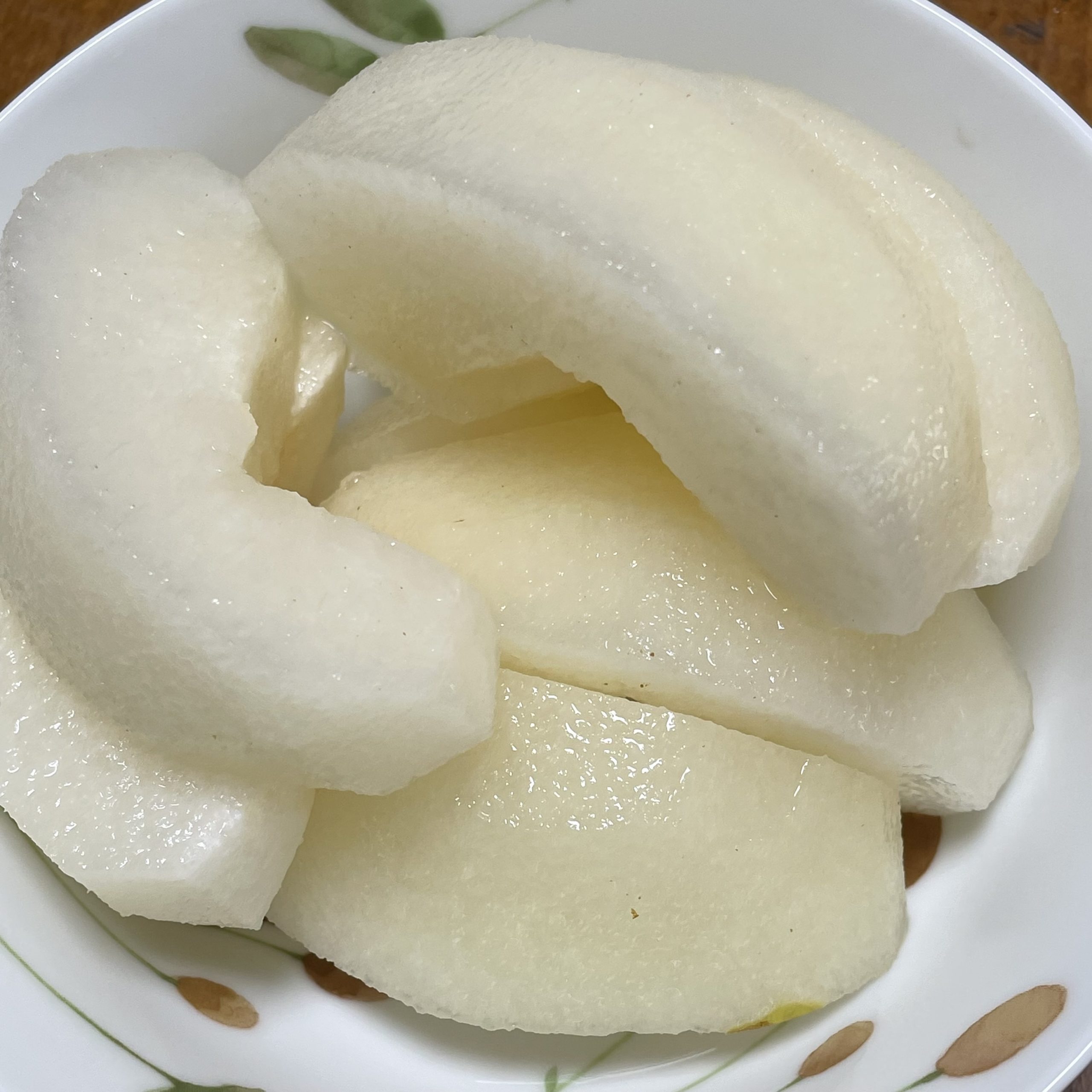 梨をいただく 今日のできごと 2024.09.06 朝食後のデザートでいただきものの梨をいただきました。これも、草刈りウォーキングの副産物です。 自分の健康管理で、食べ物をいただけるなんてすんばらしいですね。