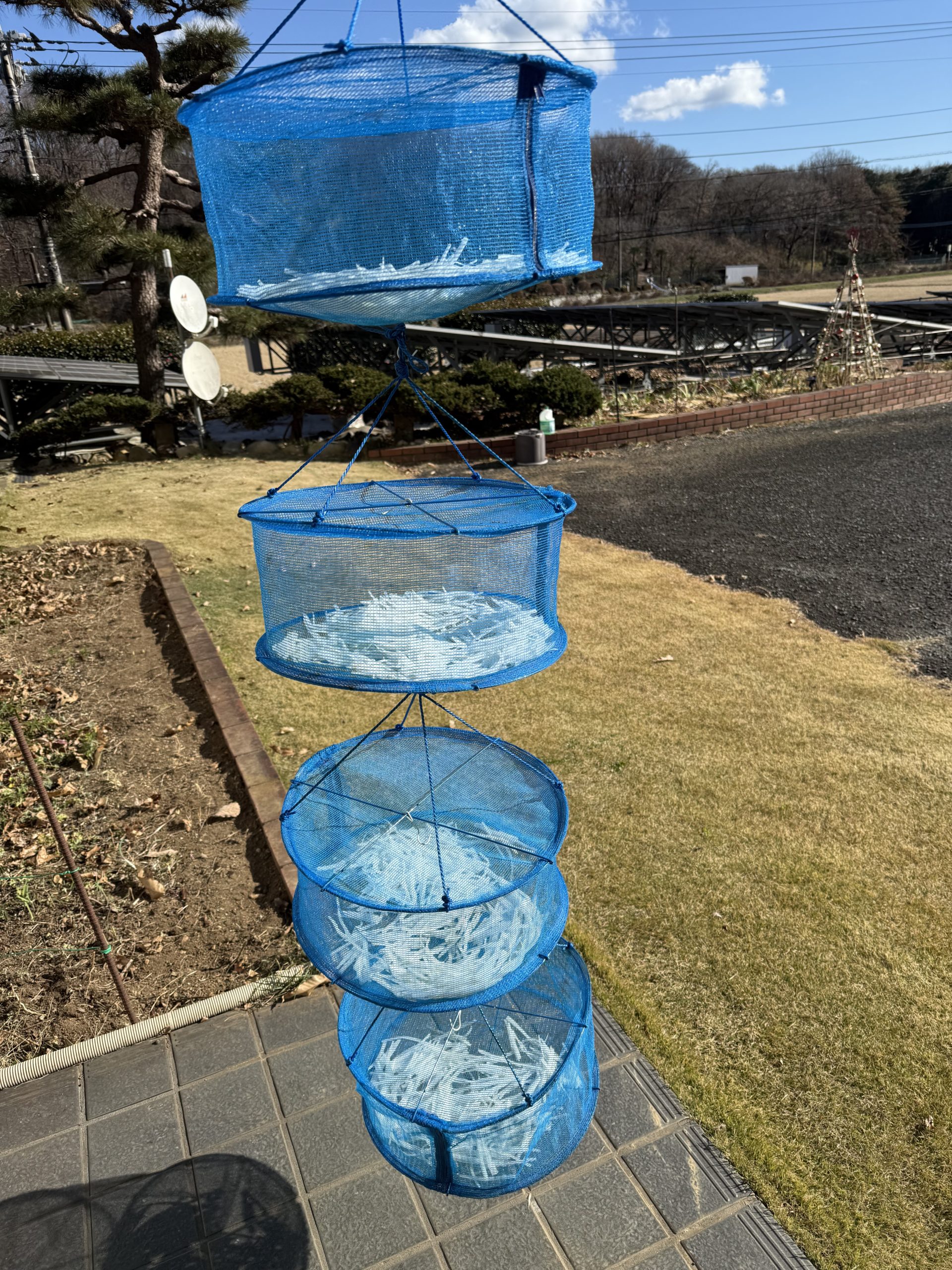 > 風が少々ありましたがとってもいい天気。神様が切り干し大根作りをしました。