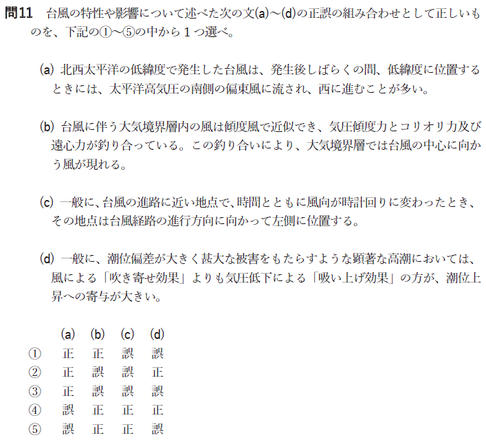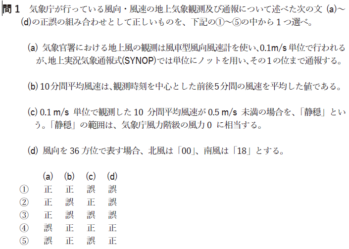 a 正 気象庁では、風車型風向風速計を使い、0.1m/sの単位まで観測。地上実況通報式(SYNOP 電文形式気象通報)で、風速はノットを使い2桁の数値で通報するようです。(根拠:国際気象通報式 第8版)「その1の位まで通報する」というのが、ひっかけぽいですね。