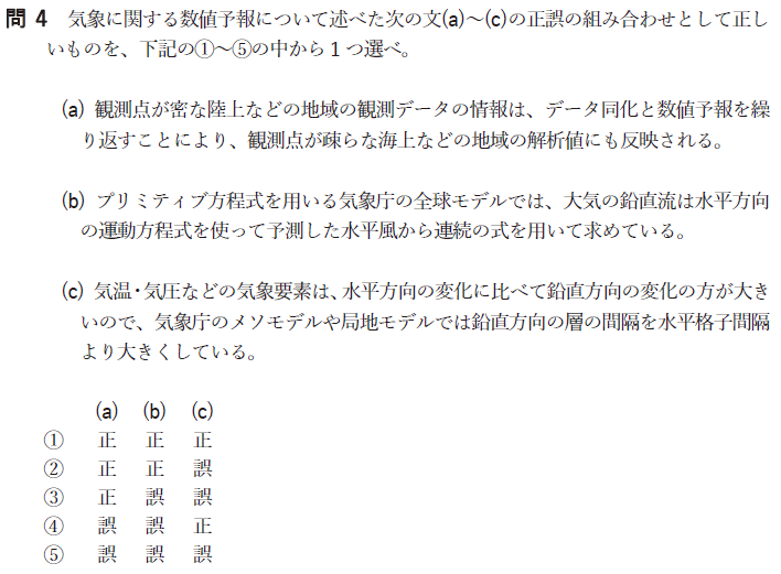 c 誤 数値予報モデルで精度を上げるために、鉛直方向の層の間隔を水平格子間隔よりも小さくする必要がある。