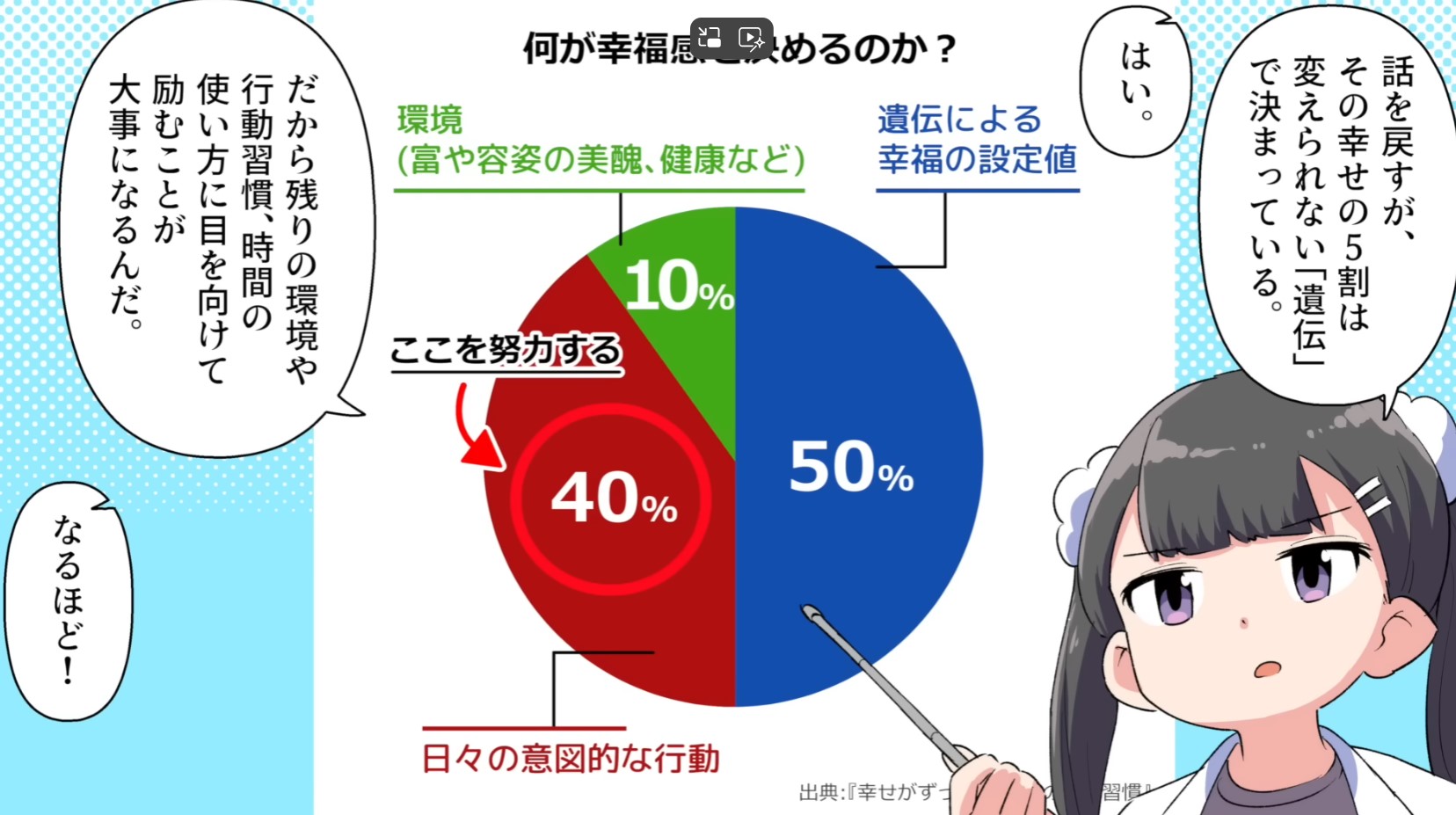 50%を占める遺伝による幸福設定値はどうしようもないので、40%を占める「日々の意図的な行動」に着目します。行動習慣が幸福感を導くということですね。そのため、何にどのように努力するかを考えて行動することが大切になってくるようです。