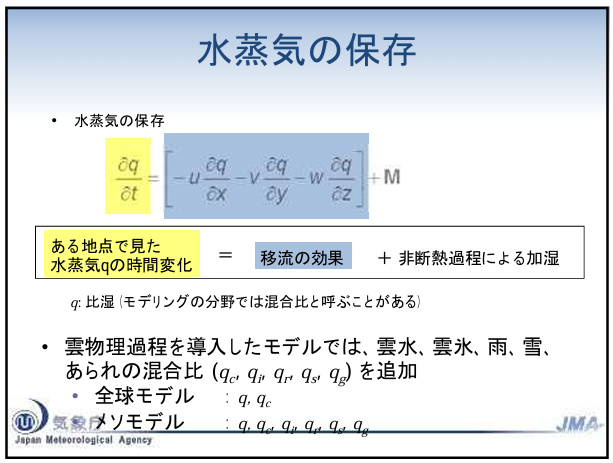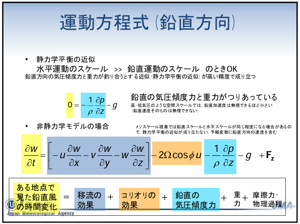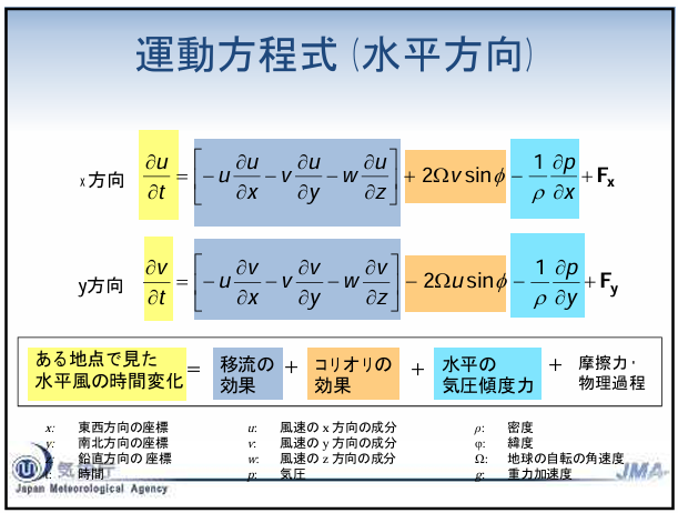 数値予報モデルの基本方程式の一つである水平方向の運動方程式は、地球の大気の動きを記述するために使用されます。この方程式は、ニュートンの運動の法則に基づいており、以下の要素を考慮します: