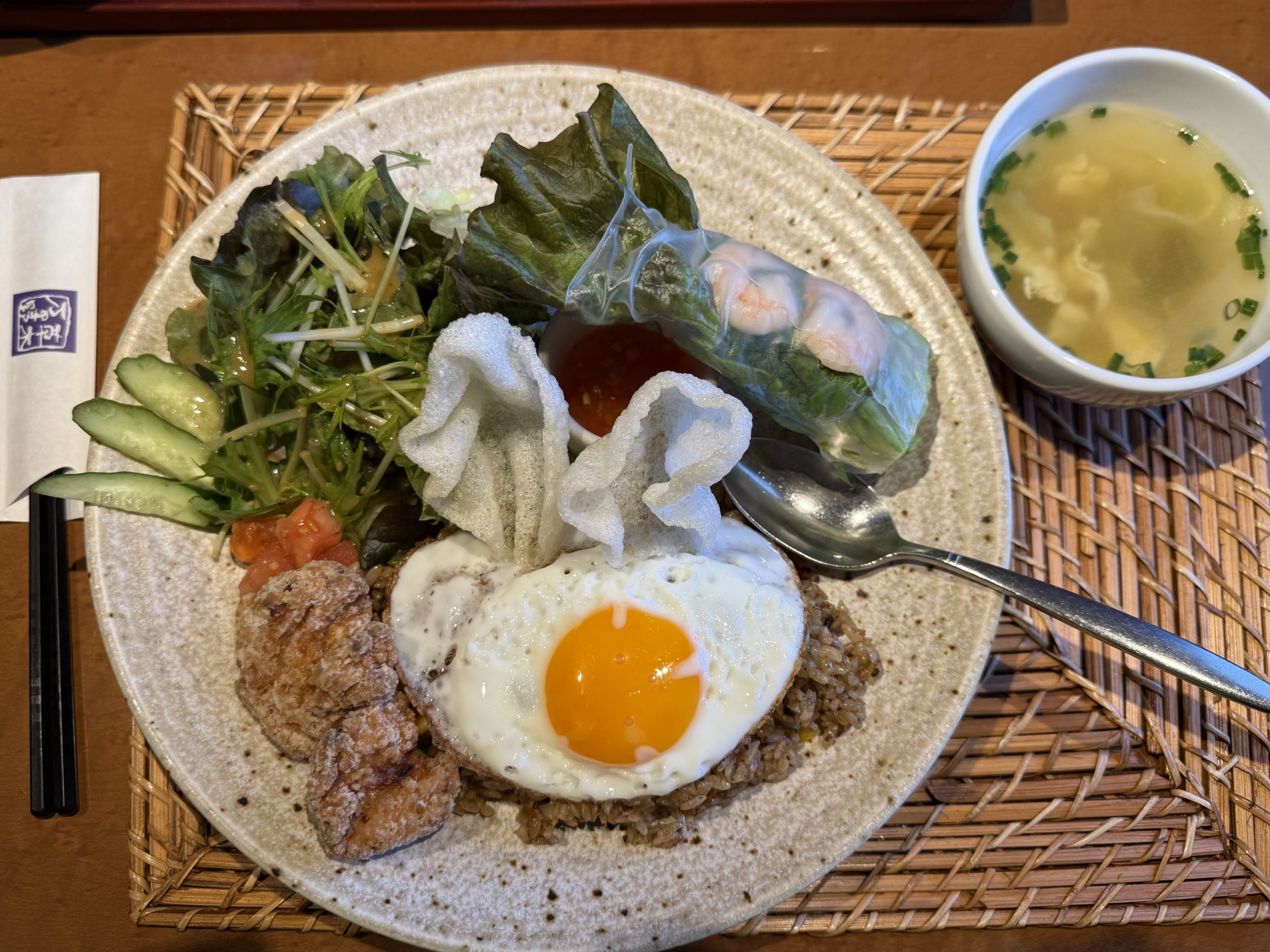 今日のランチ 今日のできごと 2024.12.25 今日は、草木万里乃に行きました。ここは、おしゃべりおばさんの溜まり場なので、声がうるさいのです。 少しうるさいような環境も、学習の集中力を鍛えるために良いかもしれません。 バリ風炒飯(目玉焼き乗せ)をいただきました。