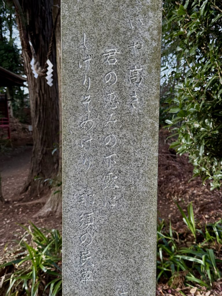 > 神社の近くに、矢板武の歌が刻んでありました。しげりそめけり那須の民草…