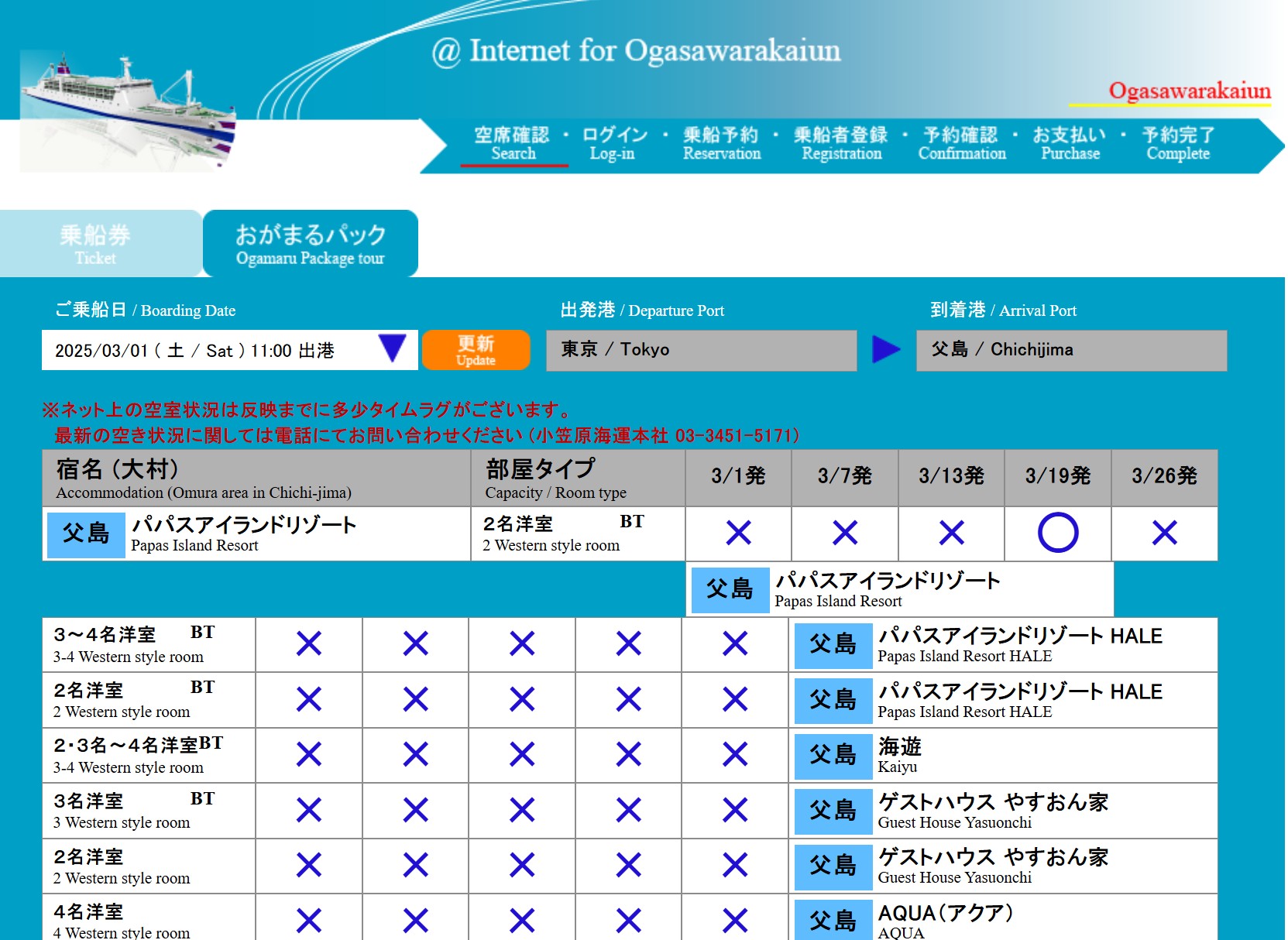 ちなみに、今日現在、直近で可能なのは3/19(水)しかありません。ちなみに、宿は1つしか空きがありませんでした。明日は建国記念の日でお休みなので、2/12にアプローチしてみたいと思います。