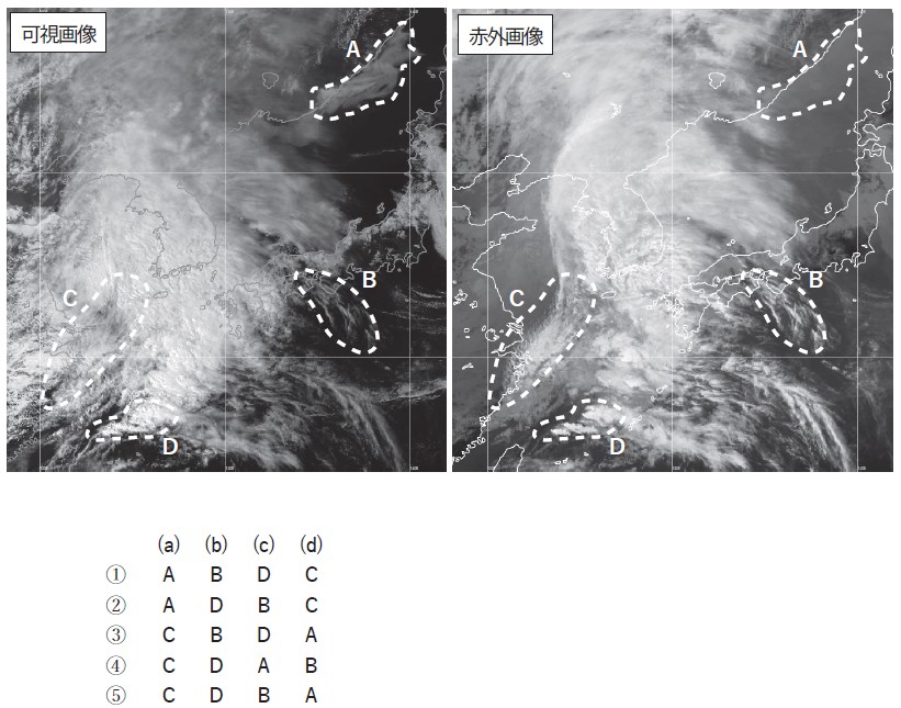 問8 図は,4月のある日の15時における気象衛星画像(可視,赤外)である。破線で囲まれた領域の雲域について述べた次の文(a)~(d)と領域A~Dの組み合わせとして,適切なものを1~5の中から1つ選べ。