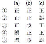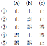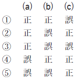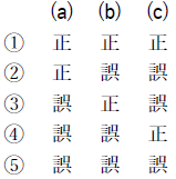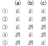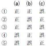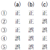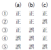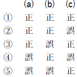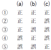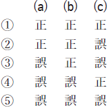 問5 気象庁では,メソモデルの初期値や境界値に少しずつ異なった誤差(摂動)を人工的に加えて複数の予測を行うメソアンサンブル予報を運用しており,その一つ一つの予測をメンバーと呼ぶ。このメソアンサンブル予報について述べた次の文(a)~(c)の下線部の正誤の組み合わせとして正しいものを,下記の1~5の中から1つ選べ。