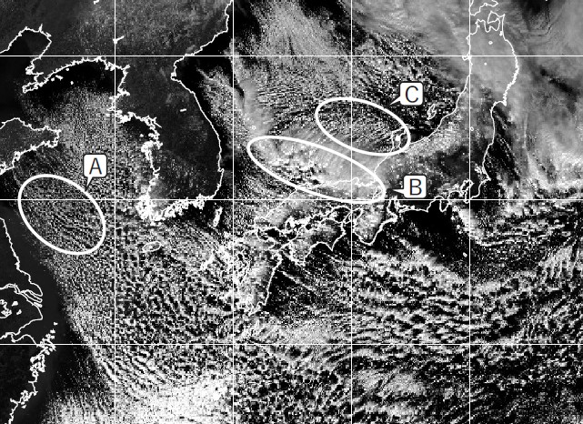 (c)大気下層において、北西からの季節風に対してほぼ直交する走向をもつ筋状雲が見られます。領域Aのパターンの雲は「Lモード」とよばれているのに対して、このパターンは「Tモード」とよばれています。特に朝鮮半島北部の山岳の 風下から北陸沿岸にかけて,しばしば大規模なTモード の雲パターンがみられることがあります。Tモードの雲もほかのLモードの雲 と同じく,大気下層の平均的な吹き出し の方向に動いています。よって正