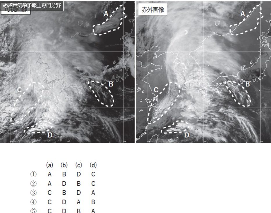 問8 図は,4月のある日の15時における気象衛星画像(可視,赤外)である。破線で囲まれた領域の雲域について述べた次の文(a)~(d)と領域A~Dの組み合わせとして,適切なものを1~5の中から1つ選べ。