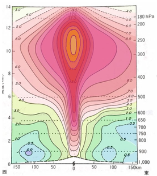 - (c)上昇流が対流圏界面付近まで達しますと、弱いながら眼の中で下降流となる空気の流れに別れます。よって、「正」