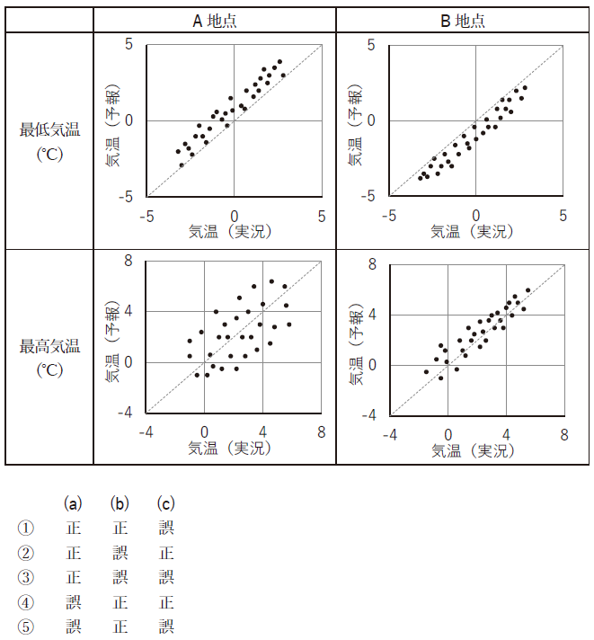 - (a) 最低気温の予報の平均誤差(ME)に正の偏りがあるのはA地点、最高気温の予報の二乗平均平方根誤差(RMSE)を比較して予報精度が良いのはB地点。よって、「正」