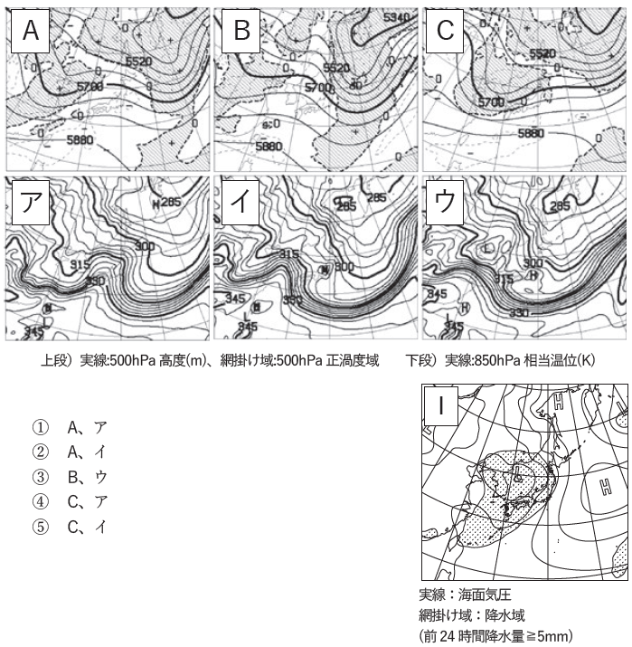 前線は850hPa面の等相当温位線の集中帯の暖気側に対応しますので、まず850hPa相当温位ではアの図に最も対応すると判断されます。したがって、500hPa面では先ほど求めた順序でCの図なり、トラフとの位置関係とも適合していると判断されます。