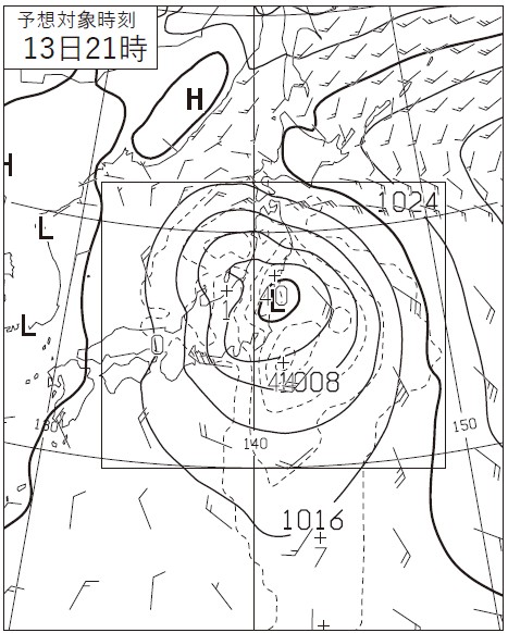 さて、「図6~図8を基に」と書いてあるので、「図6右下12日21時」「図7右下13日9時」「図8右下13日21時」、3枚とも「地上気圧・降水量・風○時間予想図」に描かれている低気圧Lが目印となります。