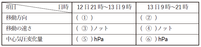 (2)図6~図8を基に、地上低気圧の12時間後から36時間後にかけての移動と中心気圧の変化についてまとめた次表の空欄(1)~(6)に入る語句または数値を答えよ。