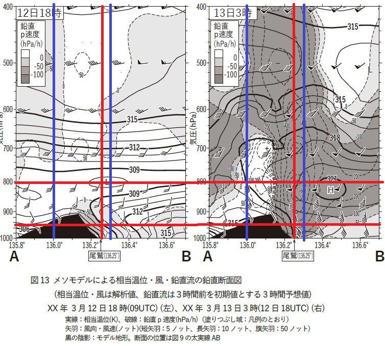 図13はメソモデルによる尾鷲を通る北西~南東走向の鉛直断面図(断面の位置は図9を参照)で、左は尾鷲で雨が強まる前の12日18時、右は低気圧が接近して尾鷲で雨が強まった時間帯に近い13日3時の状態を示す。この図を用いて以下の問いに答えよ。