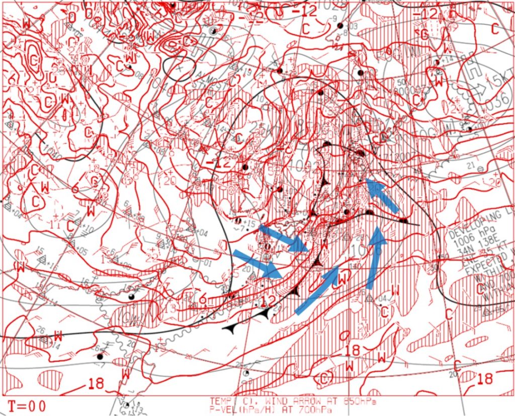 そもそも、「850hPa気温・風/700hPa上昇流」が見づらいのですが、地上天気図と重ねあわせてみると前線周囲の風の向きや温度・上昇流(網掛け領域)などが分かります。前線解析①~等温線と前線~