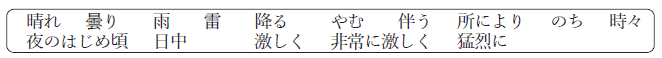 また,天気予報文は,以下の【 】内の例にならい,下枠の中の予報用語のみを使用し,それらに必要に応じて助詞の付加および動詞の活用を行って作成するものとする。なお,これ以外の予報文の表現は気象庁予報用語に従うものとし,発雷確率は20%以上で発雷の可能性が高いものとする。
