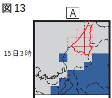 以上より(1)の考察の「現象の発現が予想される地域の合計面積が対象予報区全体の50%未満」という条件と(2)①の考察の「図13Aの格子に対応する図13Bの数値が1mm以上の場合、「雨」予想となる。」という条件とを照合させますと、ここまでの予報は「曇り 所により雨」ということになります。