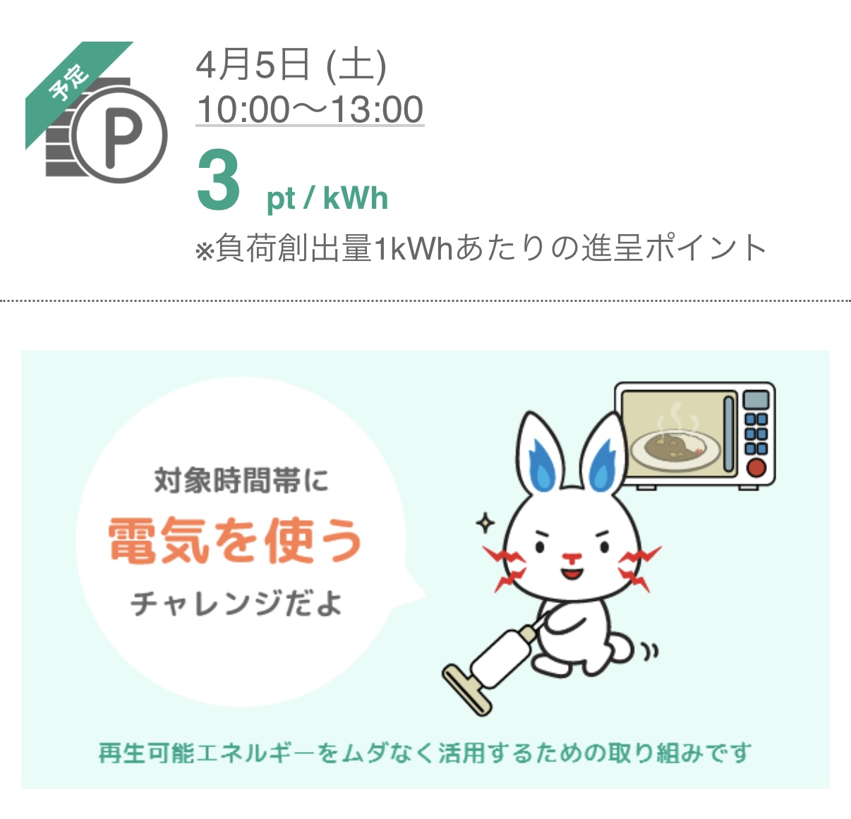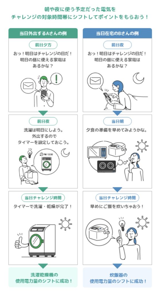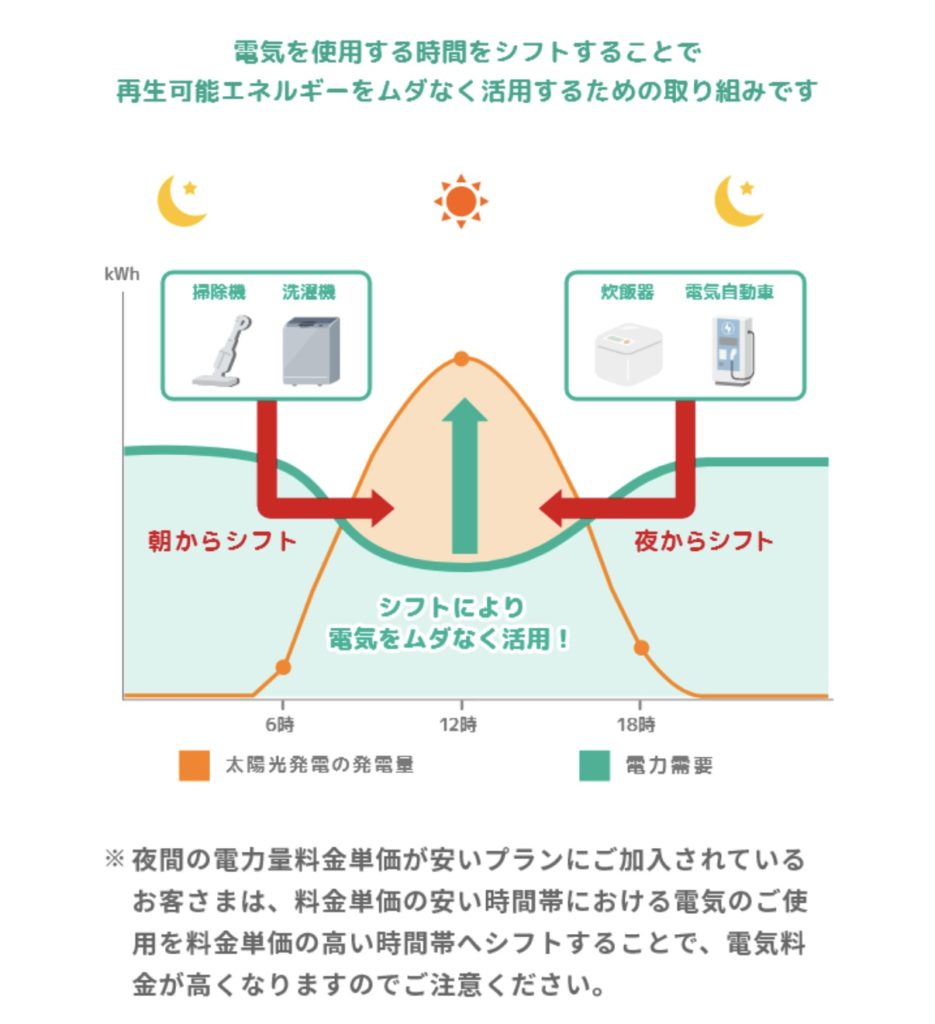「日中の高い電気を買うとポイントが付きますよ!」…そうすると、支出は増えますが、エコになります。そうしてくれると、1kwhあたり3ポイント付けてあげますよ。