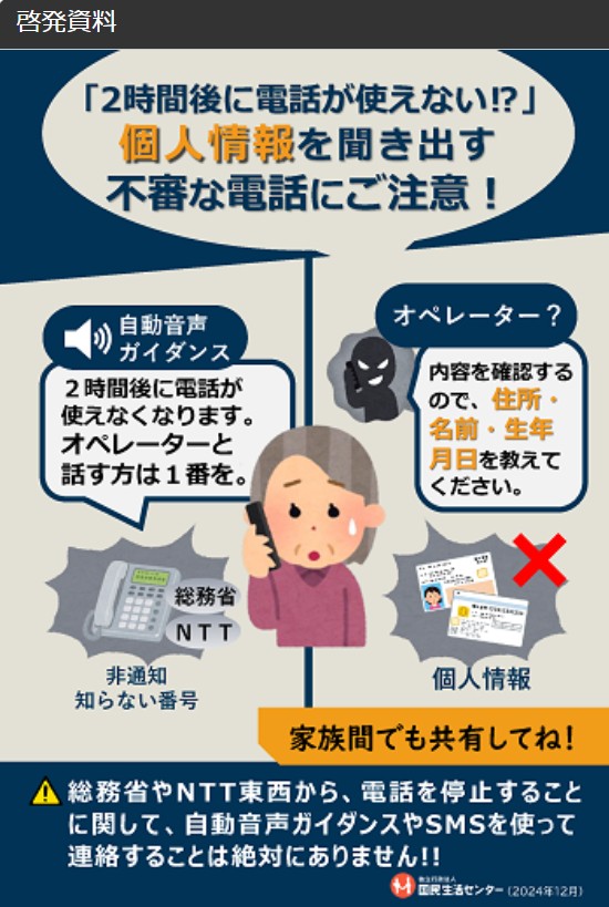 「2時間後に電話が使えない!?」個人情報を聞き出す不審な電話にご注意!(発表情報)_国民生活センター