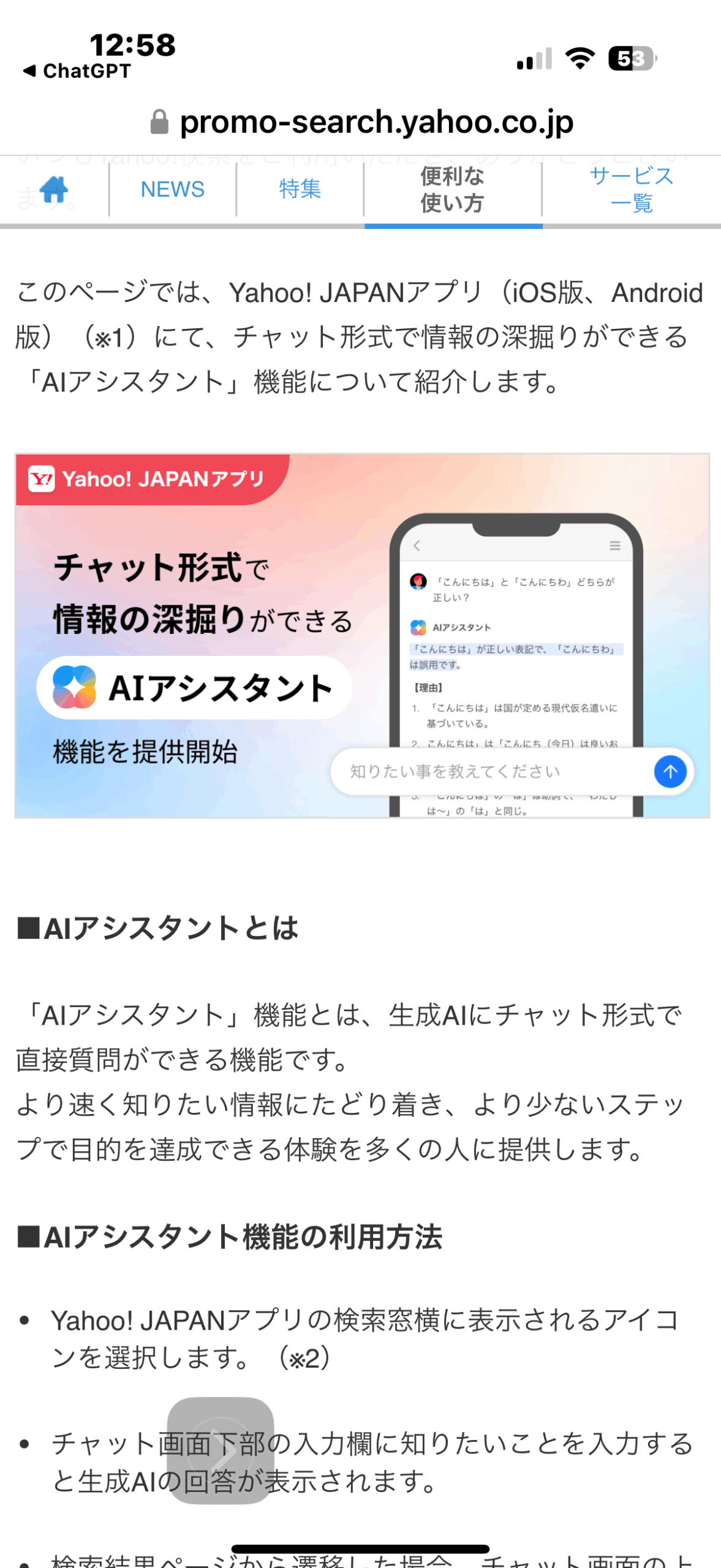 普段から使っているYahoo! JAPANの検索窓に、いつのまにかAIアシスタントに質問する機能がついていました。