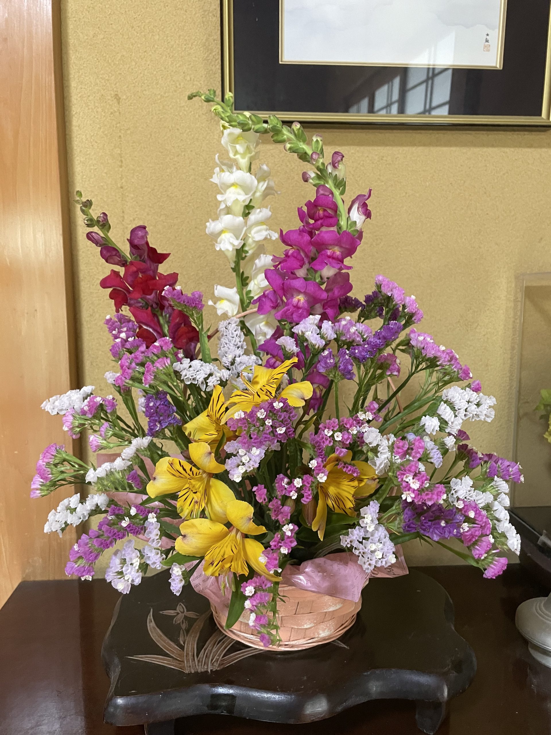 神様からフラワーアレンジメントの画像が届きました。材料費は、250円だそうです。安くてきれいで、スンバラしいですね。