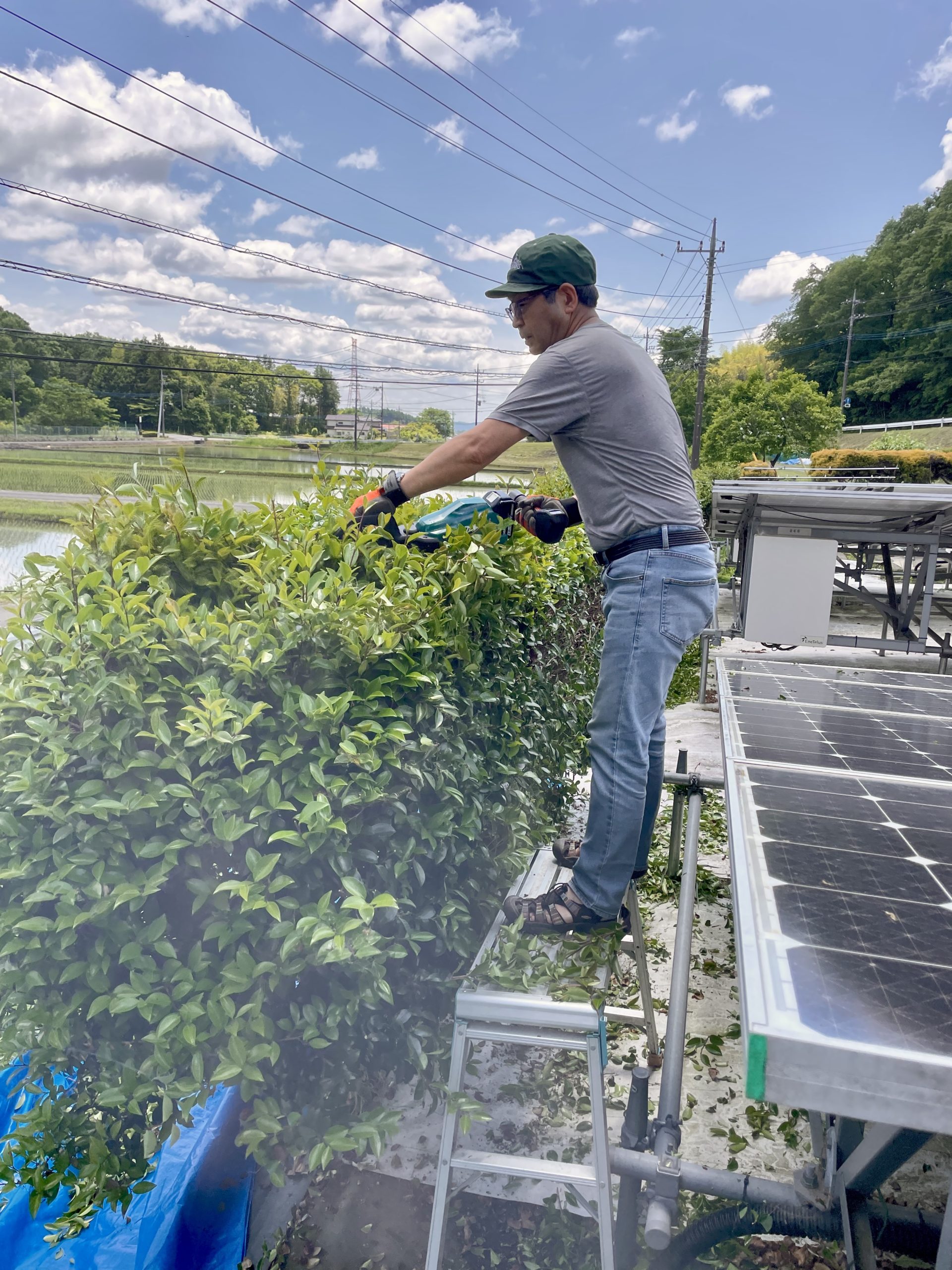 注文しておいたヘッジトリマーが午前中に届きました。バッテリーを充電し、本体にグリスを注入し、刃にチェーンソーオイルを垂らし、ブルーシートを敷き、さっそく剪定を開始しました。