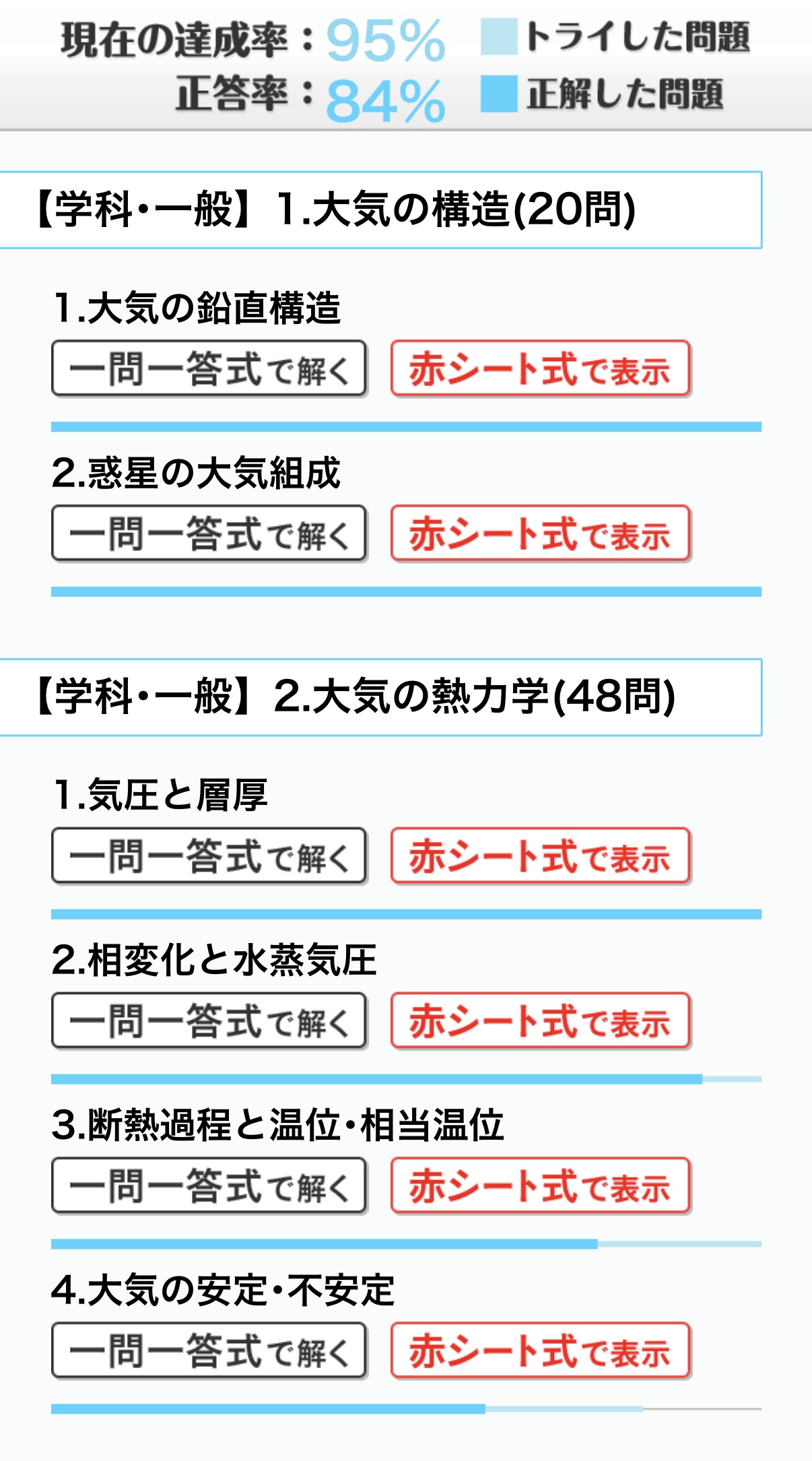 今日で630問中の95%が終了しました。手付かずの問題が残り30問というところにたどり着きました。表示されている正答率84%は、630問を100としての値ですので、実際は、88%の正答率。