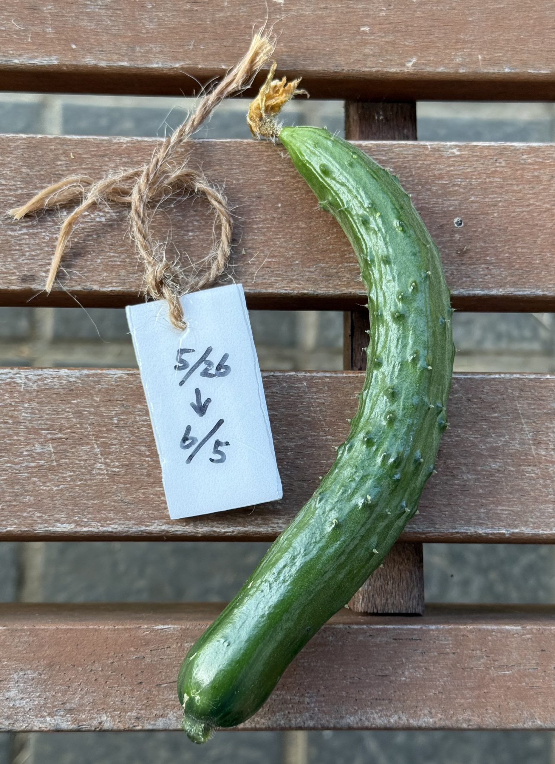 > 今年の初キュウリが一本収穫されました。味噌キュウでいただきました。