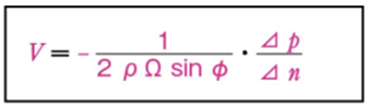 ②地衡風の風速は下の式で表される。(Ω:角速度 Φ:緯度 Δp:気圧傾度 Δn:距離)