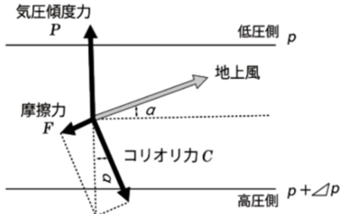 ③地表付近の地衡風は、コリオリ力fVと摩擦力Fの合力が気圧傾度力Pとつりあって吹く。