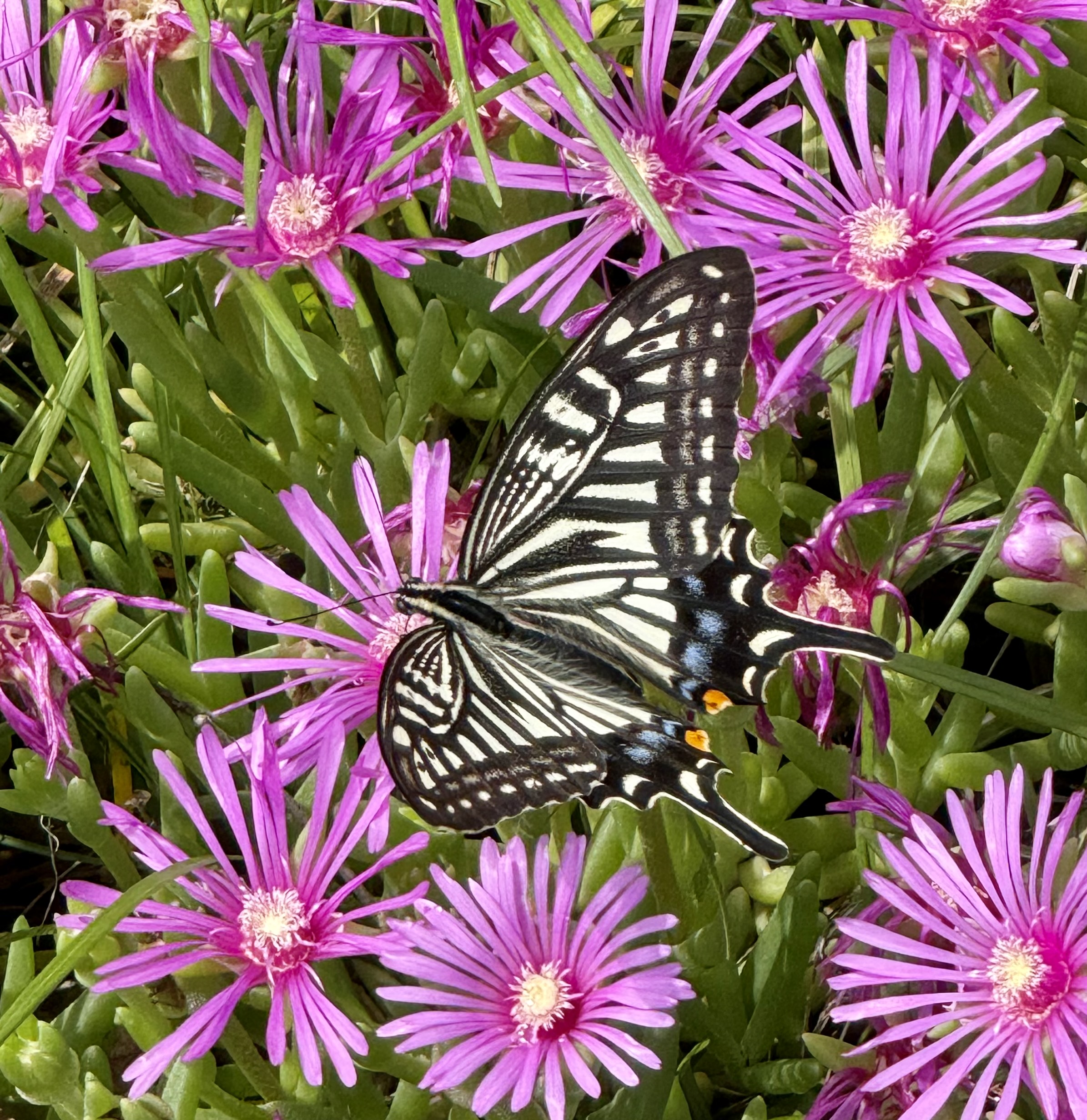 今日は、マツバギクのところにアゲハ君もやってきました。いろいろな昆虫や小動物がやってくるというのは、自然に恵まれているということです。
