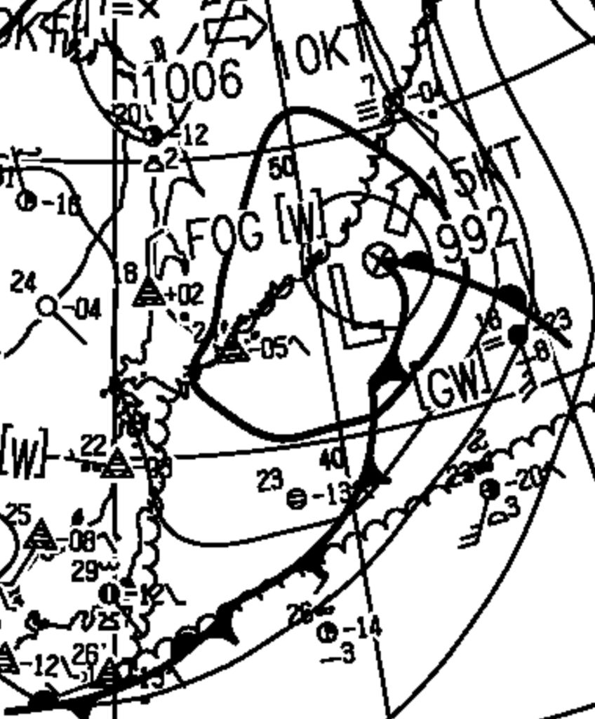 北方四島の東に低気圧があり、低気圧性循環の北よりの風がここを吹抜けたているのだと感じました。