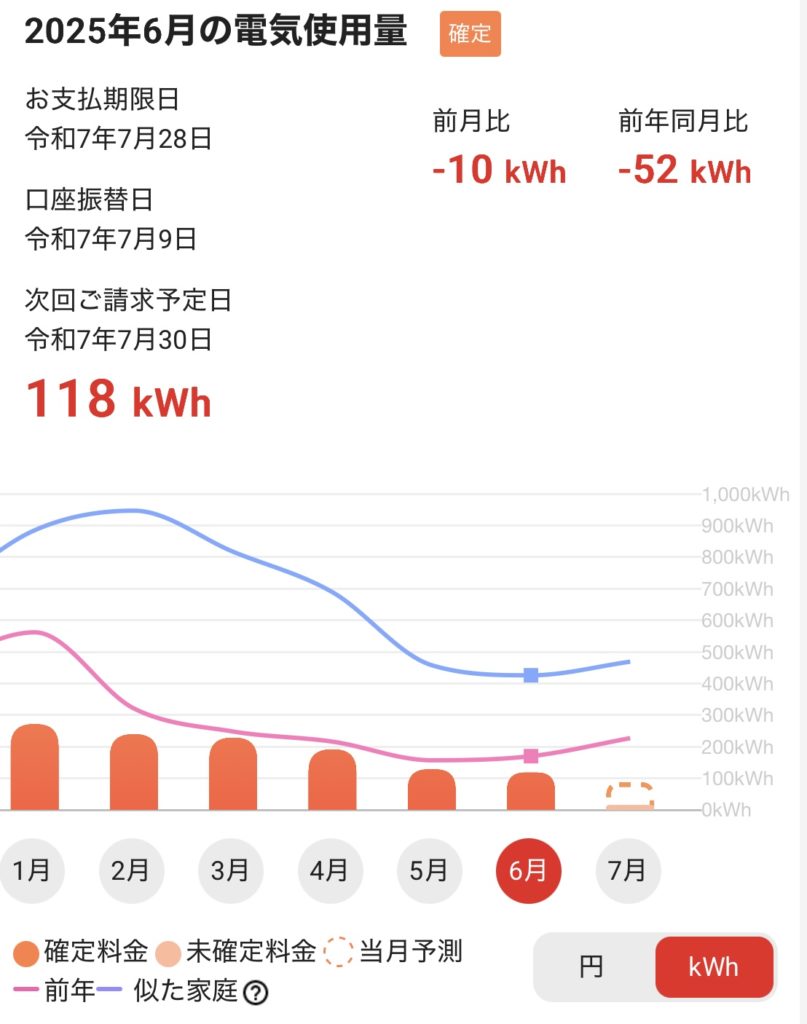 6月の電気料金 太陽光発電Screenshot 2025.06.30 6月の電気料金が出ました。前月比−332円で5,858円でした。今後も浪費をなくし、質素な生活の心がけていければよいと思います。 Screenshot