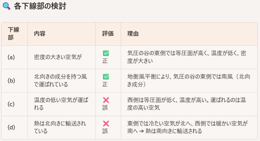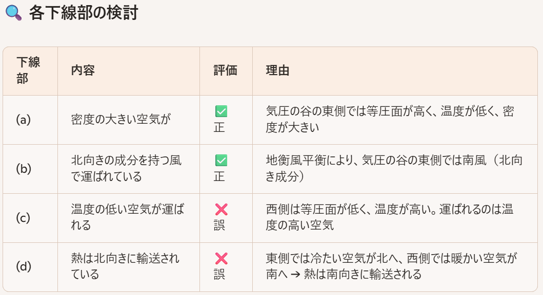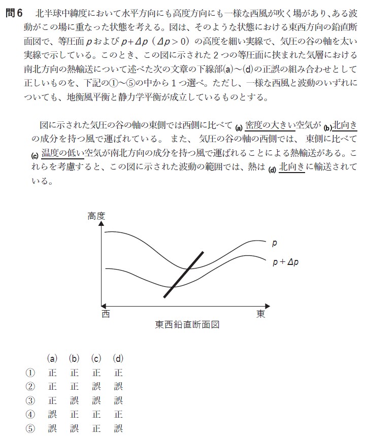 Copilot:問6は、北半球中緯度における一様な西風場に波動が重なった状況での南北方向の熱輸送について、地衡風平衡と静力学平衡のもとで考察する問題です。図と文章の内容を踏まえて、地衡風平衡・静力学平衡のもとでの南北方向の熱輸送について、各下線部の正誤を詳しく検討します。
