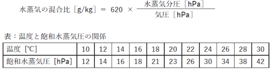 上与式(水蒸気の混合比)に、代入して計算すると、620×(18/900)=12.4g/kgと一致する。