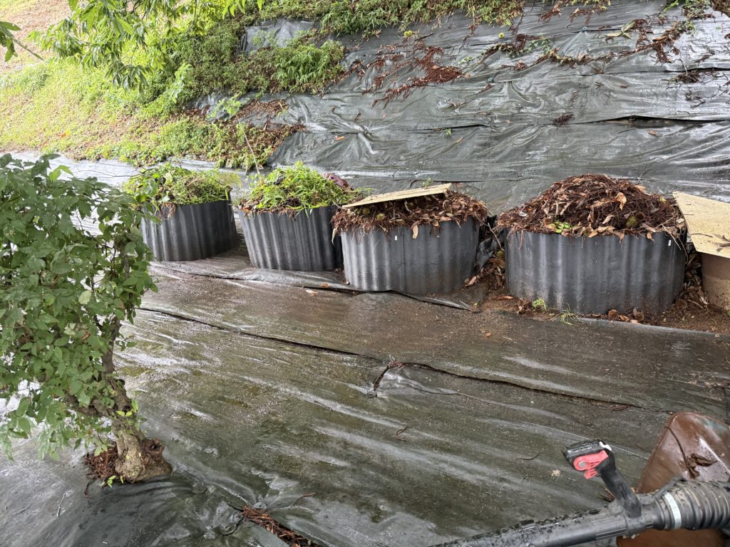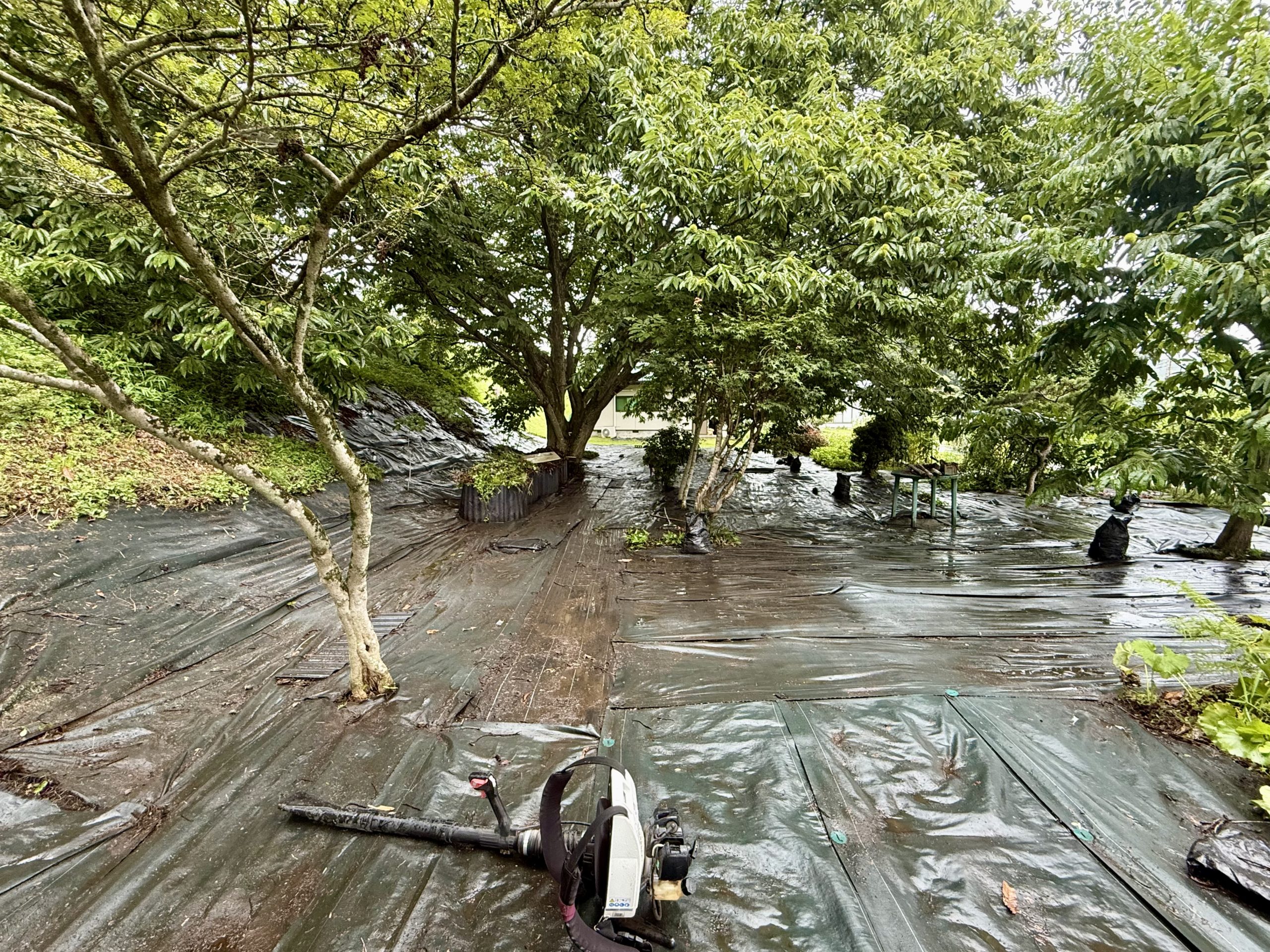 栗の木の下 今日のできごと 2025.08.10 今朝は、朝5時から栗の木の下をきれいにしました。その後、刈り払い機で縁刈りをしました。夢中になってやっていたら、11:30になっていました。雨の中、6時間以上動いてしまいました。 エンジンブロアとあぜ波板が役に立ちます。