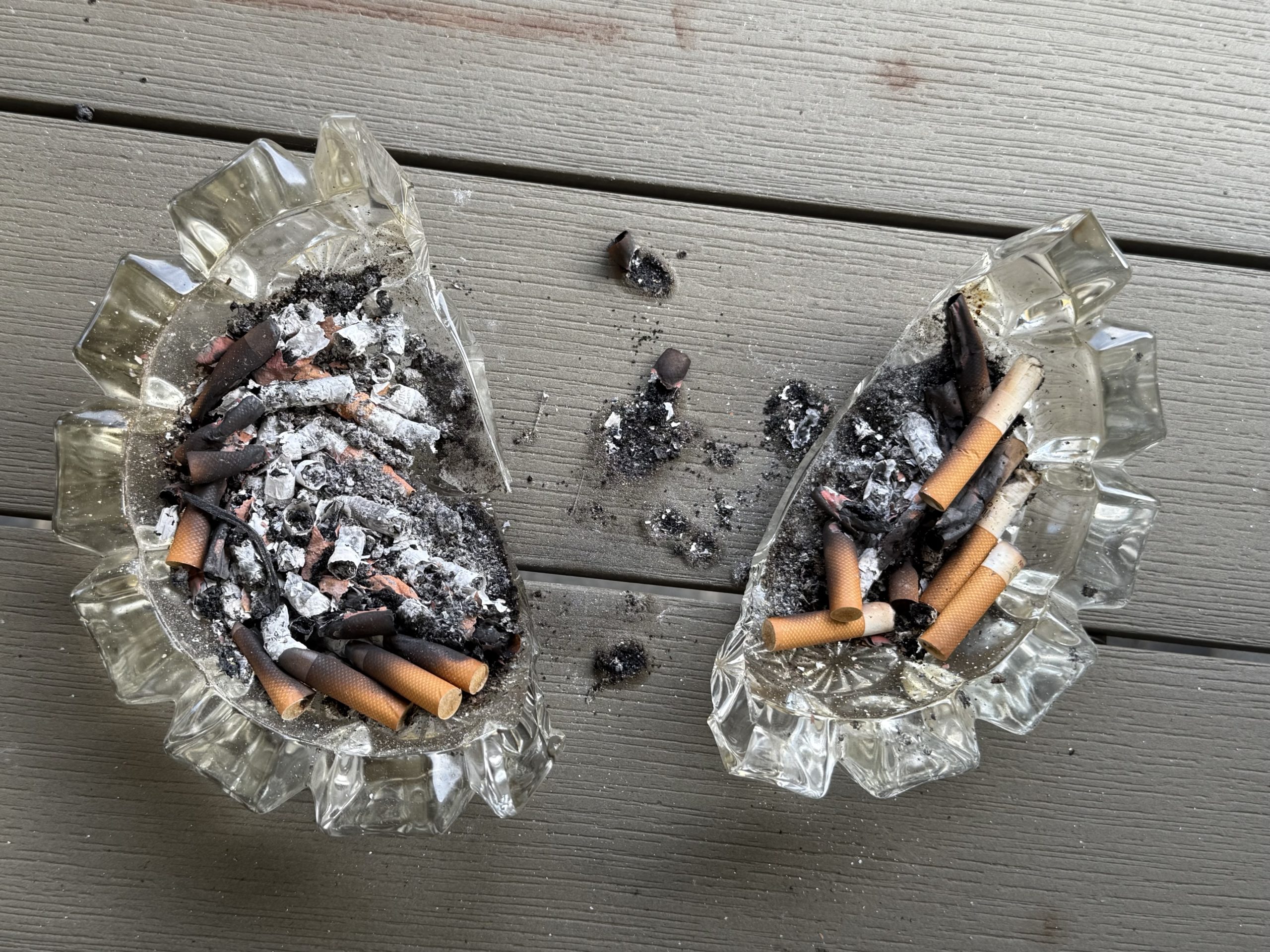 今日、人間ドックから帰った玄関先のテーブルに置いていたガラス製の灰皿が割れているのを神様が発見しました。残骸を見ると、溜まっていた吸い殻が燃えた形跡があります。
