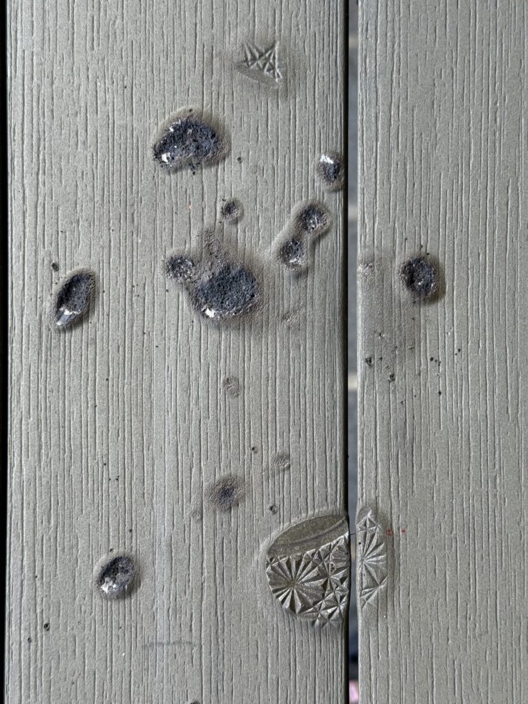 おそらく、出かける直前に一服した時の吸い殻が良く消えていなかったのではないかと思います。テーブルの表面には、灰皿の模様が焼印されていました。