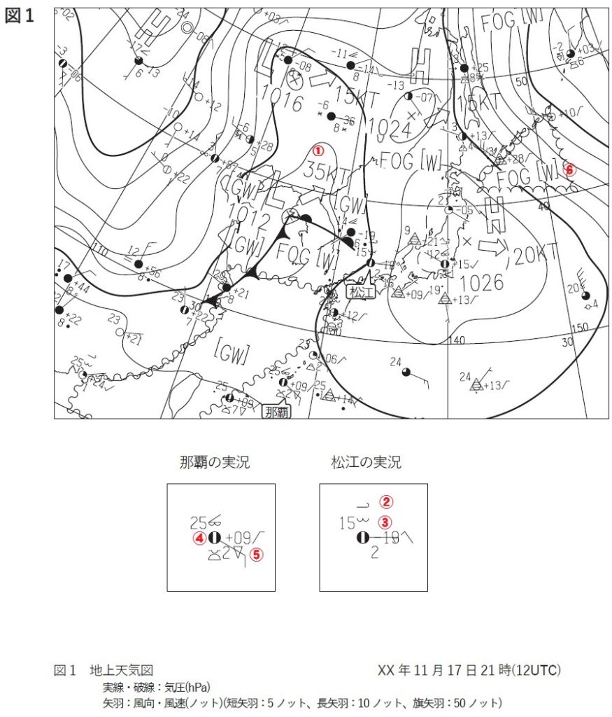 図1の地上天気図によると、黄海付近に中心気圧 1012hPa の低気圧があって、北東へ(1)ノットで進んでいる。この低気圧から温暖前線が日本海西部に、寒冷前線が華中にのびており、温暖前線に近い松江では、上層に(2)、中層に(3)が観測されている。また、三陸沖に中心気圧1026hPaの高気圧があって、東へ20ノットで移動している。この高気圧の南西側の縁辺では、暖かく湿った空気が南西諸島に流入しており、那覇の現在天気は(4)、過去天気は(5)である。