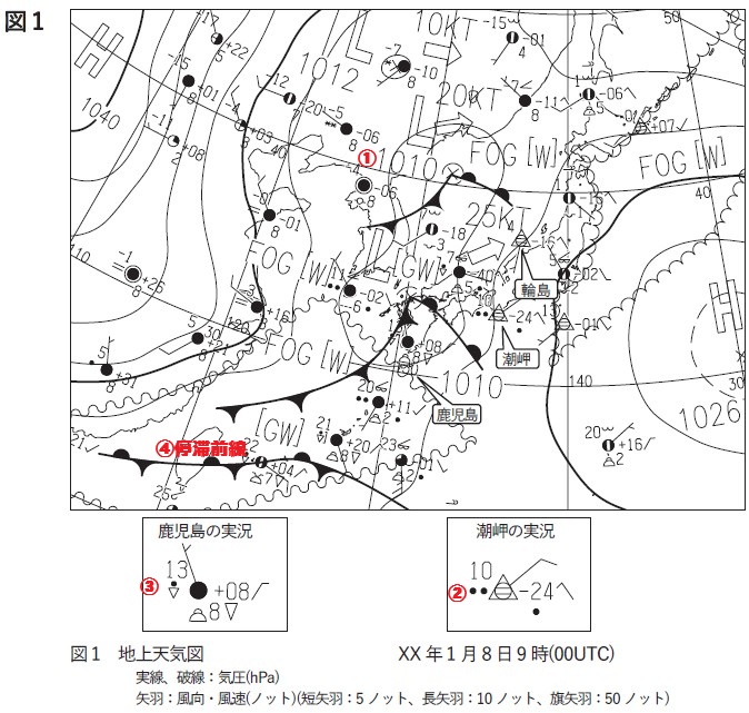 地上天気図によると、対馬海峡付近に中心気圧(1)hPaの発達中の低気圧があり、東北東へ25ノットで進んでいる。この低気圧の中心から南東に温暖前線、南西に寒冷前線がのびており、温暖前線の東側に位置する潮岬の地上観測によると、現在天気は(2)雨である。また、寒冷前線の東側に位置する鹿児島の現在天気は(3)しゅう雨である。一方、台湾海峡付近から沖縄の南にかけて(4)前線が解析されている。華北から華南にかけては、中心気圧1040hPa以上の優勢な高気圧が西から張り出している。