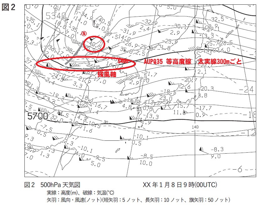 500hPa 天気図によると、中国東北区には寒冷低気圧があり、この中心付近の気温の最低値として(5)℃が観測されている。この寒冷低気圧を回り込むように分布している強風軸は、低気圧の南側では等高度線の(6)m付近に位置している。(図2参照)