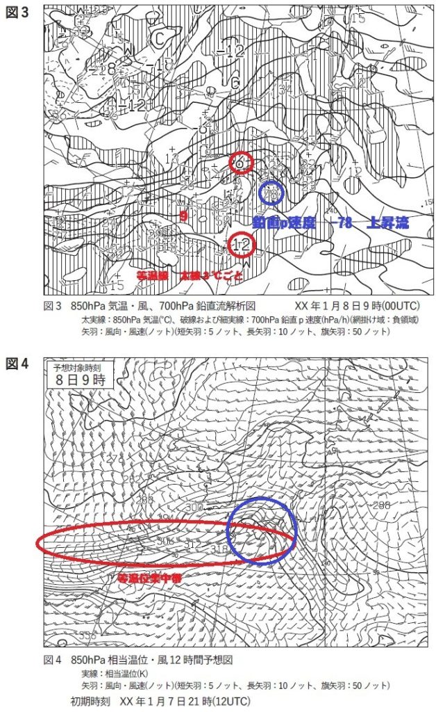 図3の解析図、図4の予想図によると、対馬海峡付近の低気圧からのびる前線とその南の停滞前線の850hPaにおける位置は、等温線および(7等相当温位線)線の分布、(8上昇流)の分布およびその極大値の位置から、それぞれ(9)℃付近と(10)C付近の等温線に対応していると推定される。