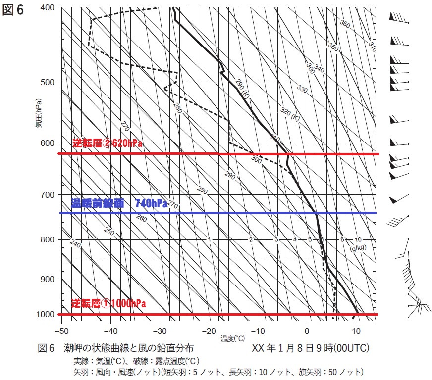 ① 図6には気温の逆転層が複数認められる。これらの逆転層のうち下層から数えて1番目と2番目について、上端の高度を20hPa刻みで答えよ。