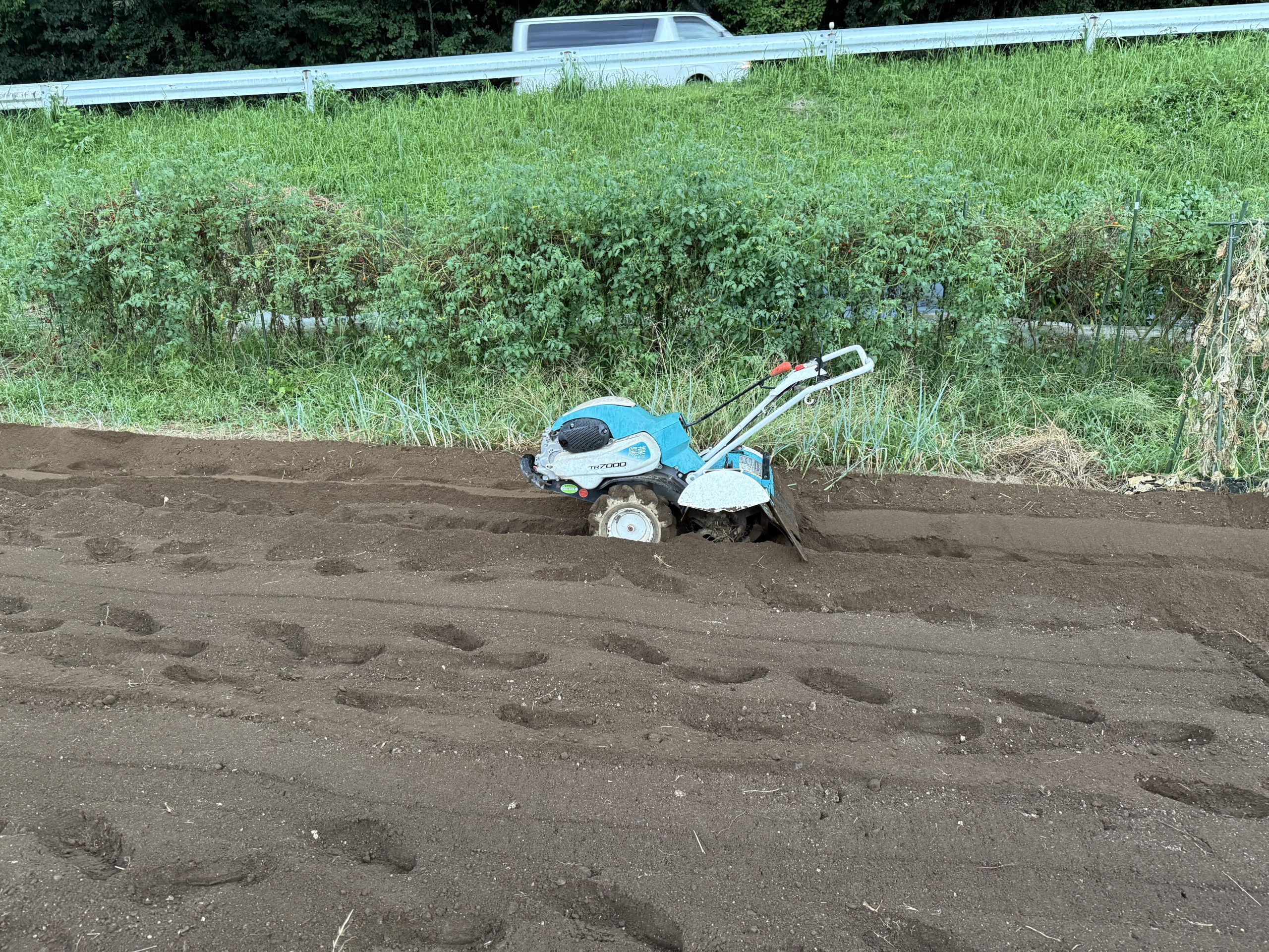 途中、ロータリーの止めピンを無くすやら、ガス欠になるわで、ぐだぐだしましたが、降りが強くなってきそうだったので、耕運機を畑に放置して退散してきました。
