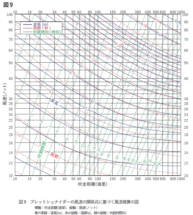 (1)図9を用いて、風浪の推算に関する以下の問いに答えよ。